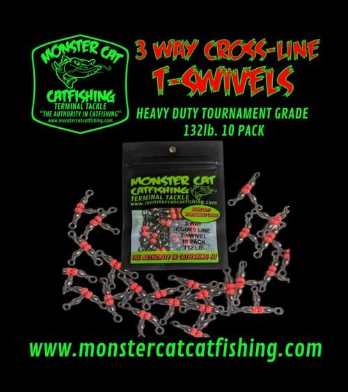 Available in convenient 10-packs, Monster Cat 3-Way T-Swivels are tournament proven, built tough, and ready for anglers who are serious about chasing down them Monster Cats.